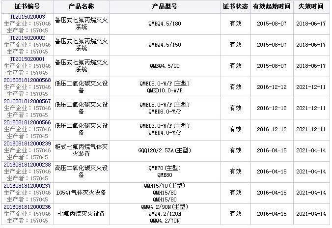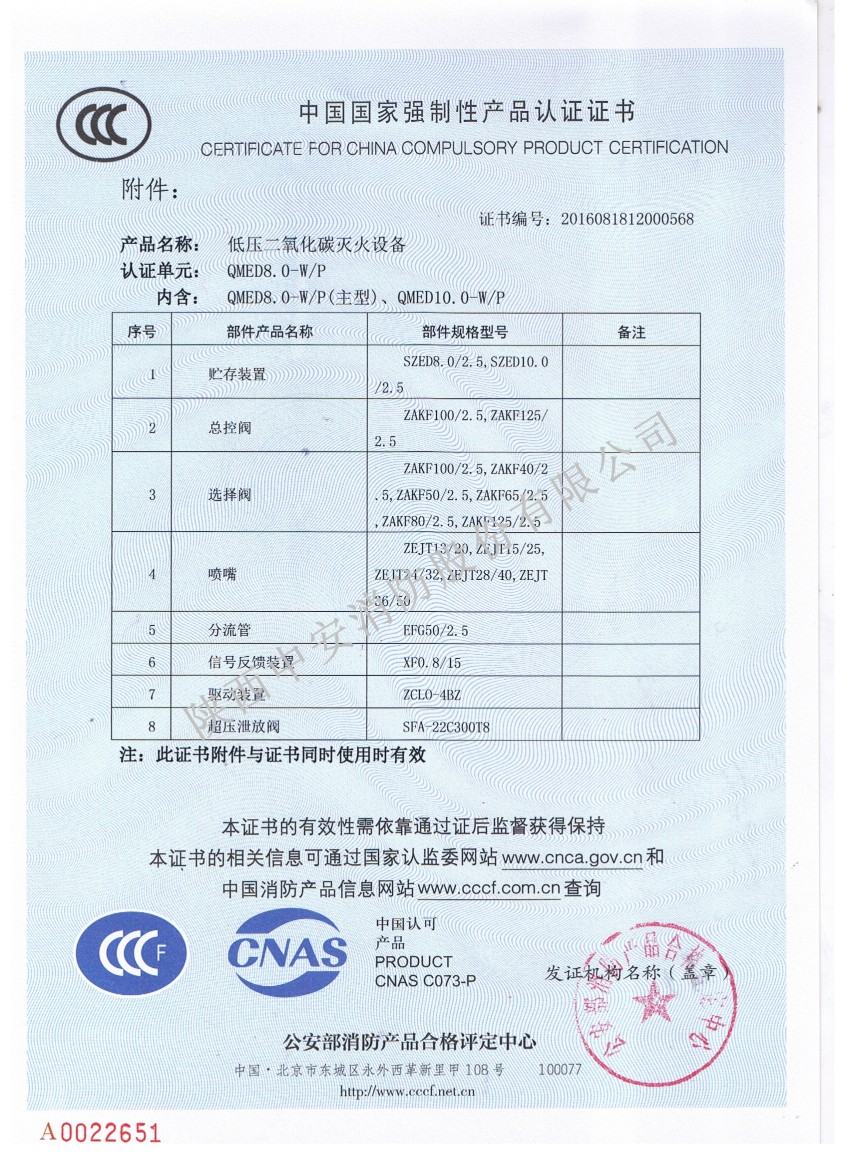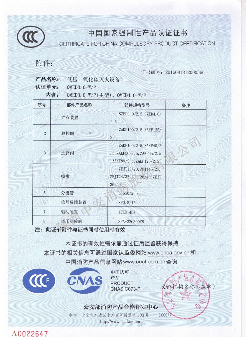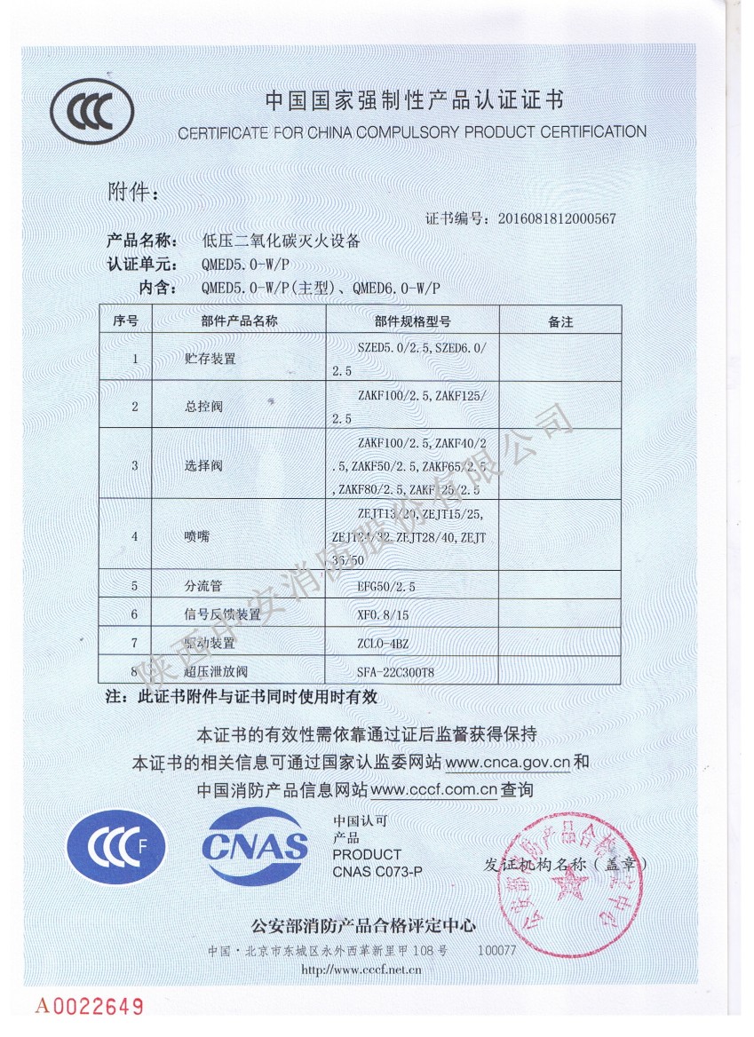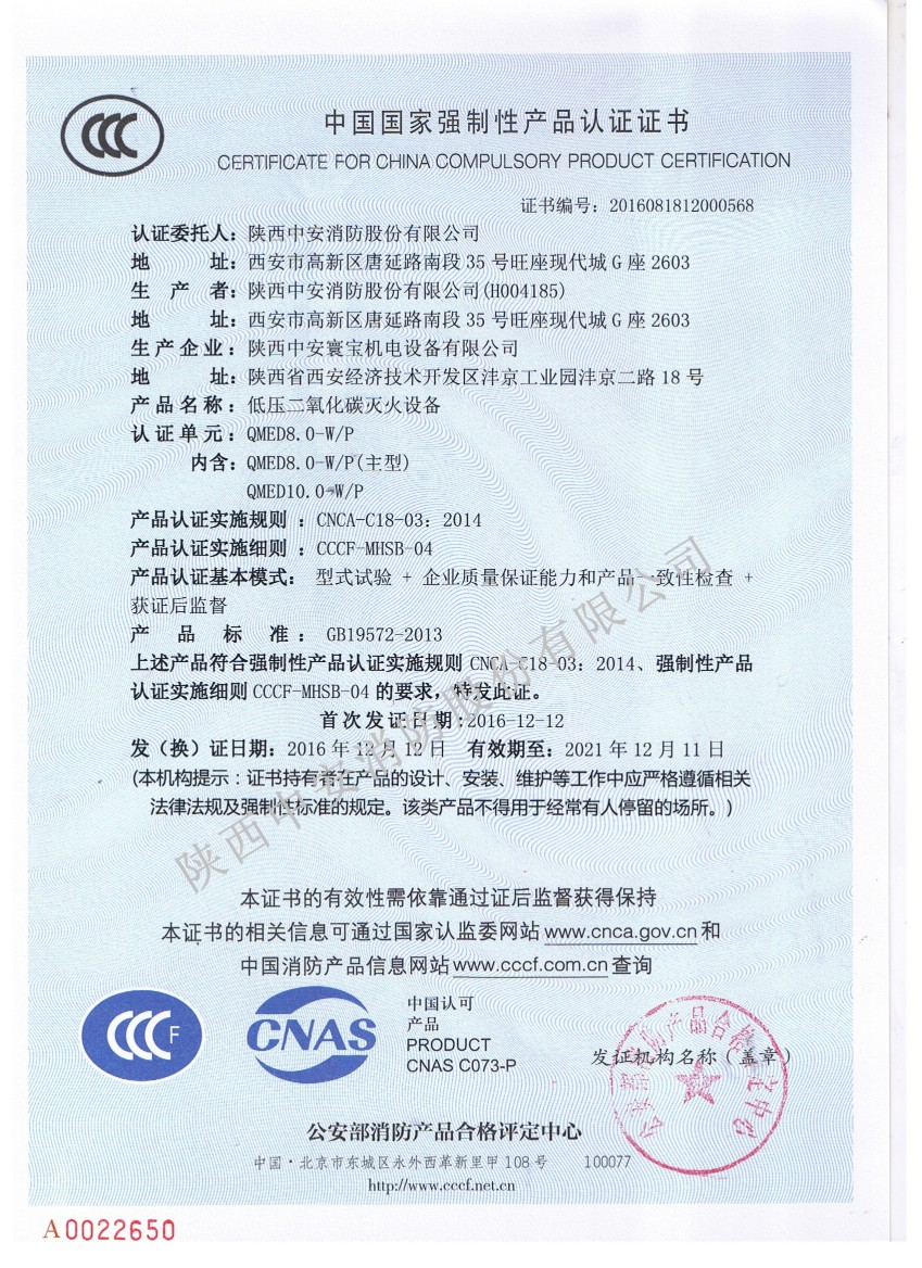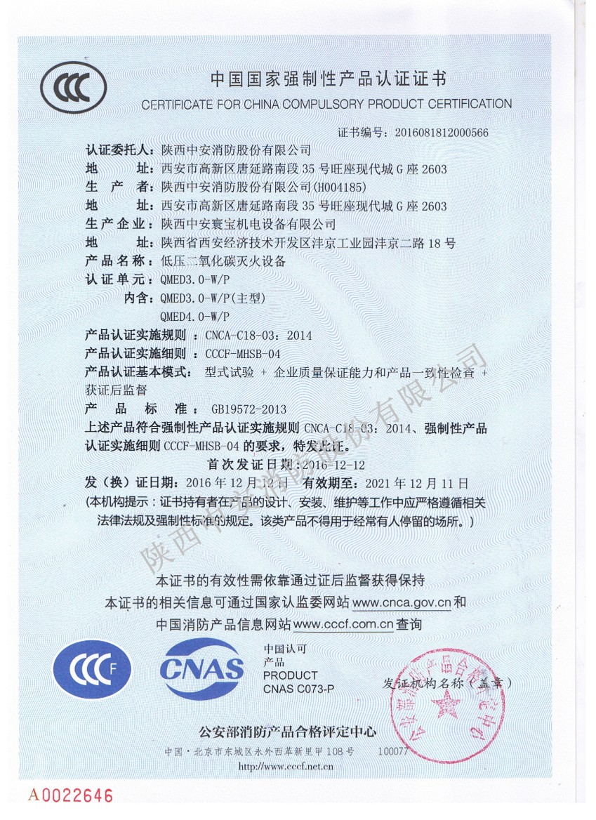 2016年12月13日,陜西中安消防集團(tuán)山西名牌產(chǎn)品的低壓二氧化碳滅火設(shè)備取得3C證書,具體情況如下: